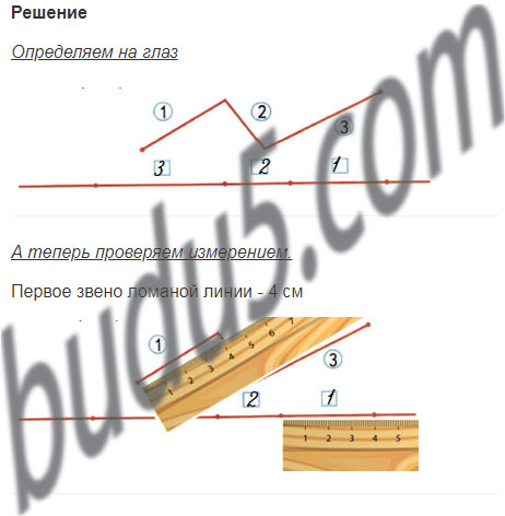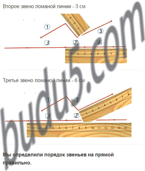 Определи на глаз и запиши в окошко номер каждого звена ломаной, отложенного на прямой. Проверь измерением.