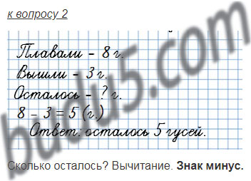На пруду плавали 4 утки и 8 гусей. На берег вышли 3 утки и столько же гусей. Сколько уток и сколько гусей осталось в воде?