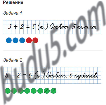 1) У кошки 3 белых котёнка и 2 чёрных. Сколько всего котят у кошки?