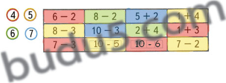 Реши примеры и раскрась карточки с ответами 4 красным цветом, с ответом 5 - жёлтым, с ответом 6 - зелёным, а с ответом 7 - синим цветом. Добавь еще два примера с ответами 4, 5, 6 или 7.