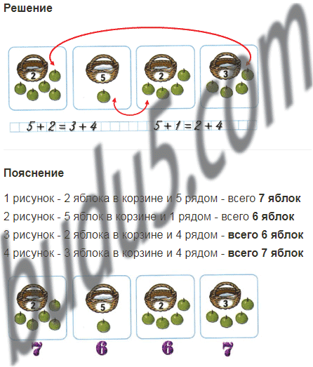На каждой корзине записано, сколько в ней яблок. Соедини линией рисунки, на которых нарисовано одинаковое количество яблок, и запиши два верных равенства.
