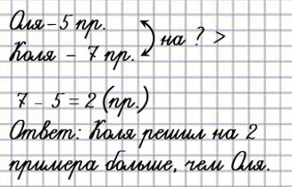 На уроке математики Оля решила 5 примеров, а Коля 7 примеров. На сколько больше примеров решил Коля, чем Оля?