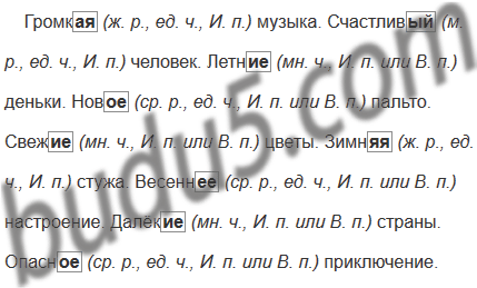 Громк... музыка. Счастлив... человек. Летн... деньки. Нов... пальто. Свеж... цветы. Зимн... стужа. Весенн... настроение. Далёк... страны. Опасн... приключение.