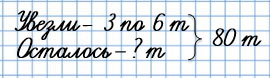 Самолёт доставил 80 т груза. После того, как часть груза увезли на 3 машинах, по 6 т на каждой, в самолёте осталось некоторое количество груза. Сколько тонн груза осталось в самолёте?
