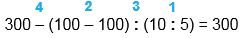 1) 10 : 5 = 2 2) 100 - 100 = 0 3) 0 : 2 = 0 4) 300 - 0 = 300 |