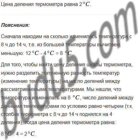 В 8 ч термометр показывал температуру 4, а в 14 ч - 12. Чему равна цена деления этого термометра, если его столбик поднялся на четыре деления?