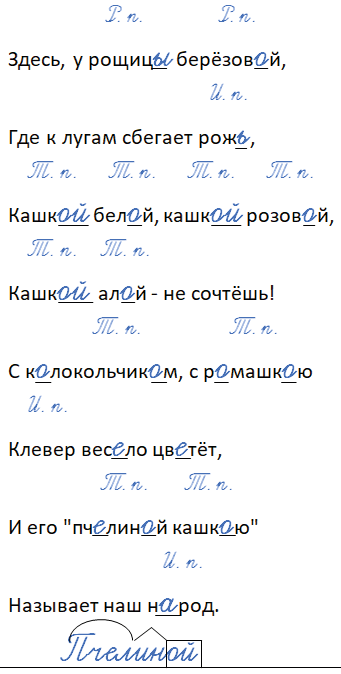 - берёзовой (Р. п.), белой (Р. п.), розовой (Р. п.), алой (Р. п.), пчелиной (Т. п.) - падежные окончания прилагательных