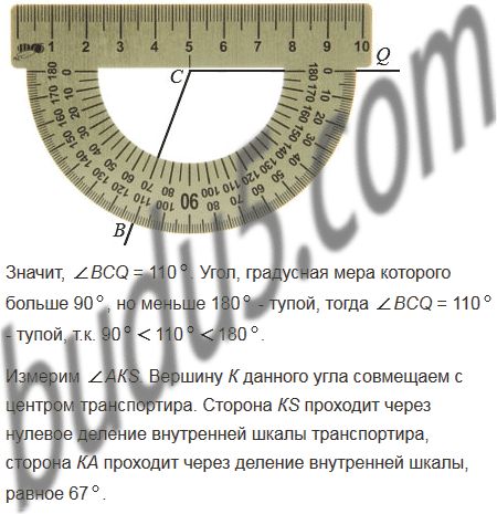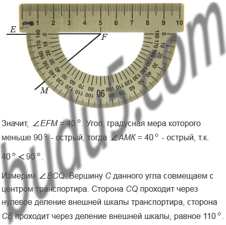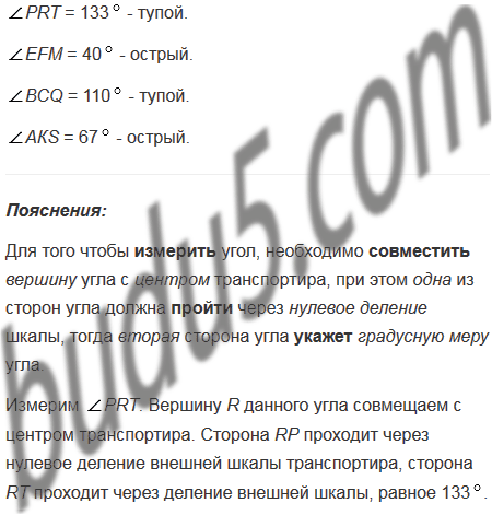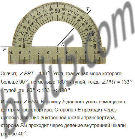 Найдите, пользуясь транспортиром, градусные меры углов, изображенных на рисунке 95. Определите вид каждого угла.