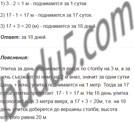 Улитка за день поднимается вверх по столбу на 3 м, а за ночь съезжает по нему на 2 м вниз. На какой день она доберется до вершины столба, высота которого равна 20 м?