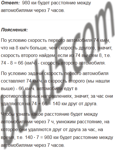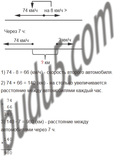 Из одного города в противоположных направлениях одновременно выехали два автомобиля. Скорость одного из них была 74 км/ч, что на 8 км/ч больше, чем скорость другого. Какое расстояние будет между ними через 7 ч после начала движения?