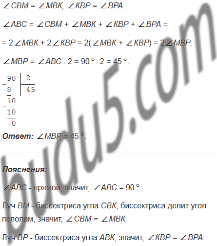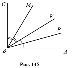Угол АВС - прямой, луч ВР - биссектриса угла АВК, луч ВМ - биссектриса угла СВК (рис. 145). Какова градусная мера угла МВР?