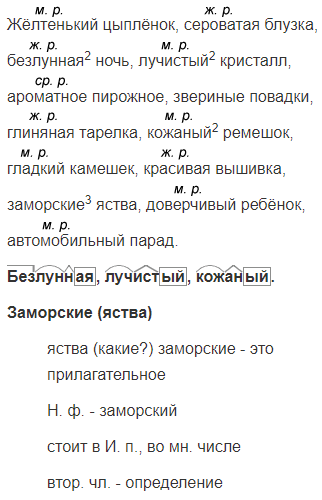 Не забудь провести разбор по составу слов безлунная2, лучистый2, кожаный2 и морфологический разбор (разбор слова как часть речи) слова заморские3.