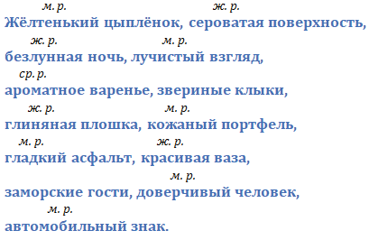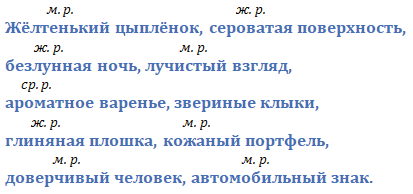 Жёлтенький цыплёнок, сероватая ..., безлунная2 ..., лучистый2 ..., ароматное ..., звериные ..., глиняная ..., кожаный2 ..., доверчивый ..., автомобильный ... .