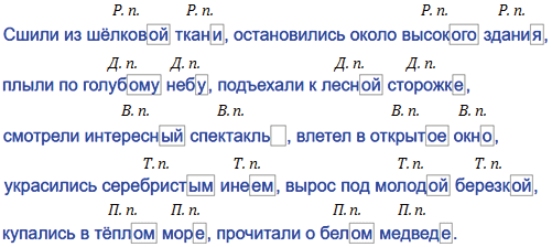 Сшили из ... ткани, остановились около ... здания, плыли по ... небу, подъехали к ... сторожке, смотрели ... спектакль, влетел в ... окно, украсились ... инеем3, вырос под ... берёзкой, купались в ... море, прочитали о ... медведе.