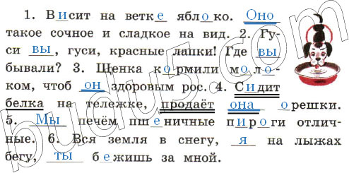 1. В_сит на ветк_ ябл_ко. ___ такое сочное и сладкое на вид. 2. Гуси ___, гуси, красные лапки! Где ___ бывали? 3. Щенка к_рмили м_л_ком, чтобы ___ здоровым рос. 4. С_дит белка на тележке, продаёт ___ _решки. 5. ___ печём пш_ничные п_р_ги отличные. 6. Вся земля в снегу, ___ на лыжах бегу, ___ б_жишь за мной.