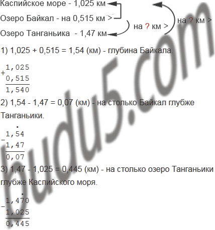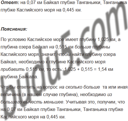 Наибольшее озеро в мире - Каспийское море - имеет глубину 1,025 км. Озеро Байкал - самое глубокое в мире. Его глубина на 0,515 км больше глубины Каспийского моря. Глубина озера Танганьика (Африка) составляет 1,47 км. На сколько Байкал глубже Танганьики, а Танганьика глубже Каспийского моря?