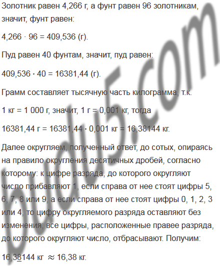 В старину в России пользовались такими мерами массы: пуд, фунт, золотник. Пуд был равен 40 фунтам, фунт - 96 золотникам. Скольким килограммам равен пуд, если золотник равен 4,266 г? Ответ округлите до сотых.