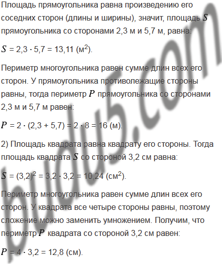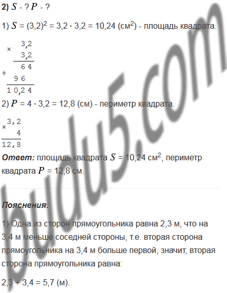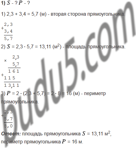 1) Одна из сторон прямоугольника равна 2,3 м, что на 3,4 м меньше соседней стороны. Вычислите площадь и периметр прямоугольника.