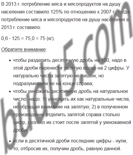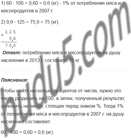 В 2007 г. потребление мяса и мясопродуктов в Российской Федерации составляло 60 кг на душу населения. В 2013 г. потребление мяса и мясопродуктов на душу населения составило 125% по отношению к 2007 г. Сколько килограммов составило потребление мяса и мясопродуктов на душу населения в 2013 г.?