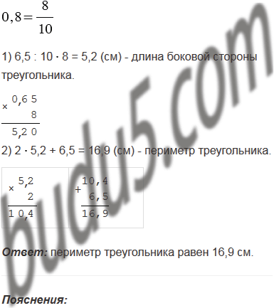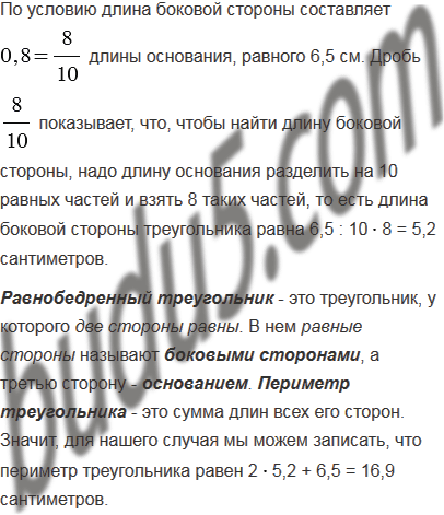 Основание равнобедренного треугольника равно 6,5 см, а длина боковой стороны составляет 0,8 длины основания. Вычислите периметр треугольника.