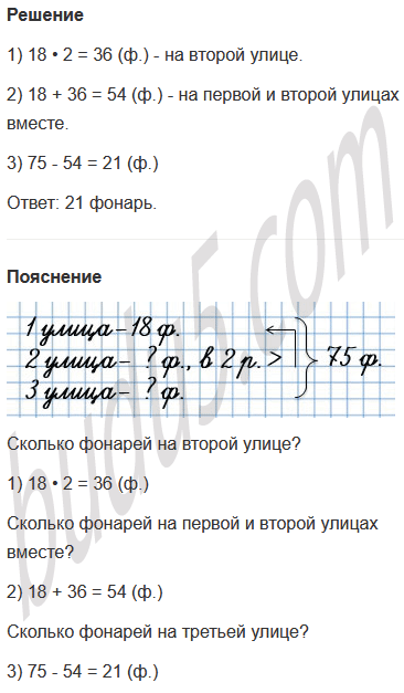 36. Три улицы города освещают 75 фонарей. На первой улице 18 фонарей, на второй улице фонарей в 2 раза больше, чем на первой. Сколько фонарей на третьей улице?