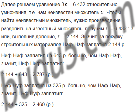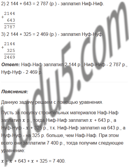 Ниф-Ниф, Нуф-Нуф и Наф-Наф купили строительные материалы для ремонта своих домиков, потратив на их приобретение 7 400 р. Найдите затраты каждого поросенка, если Ниф-Ниф заплатил на 643 р., а Нуф-Нуф - на 325 р. больше, чем Наф-Наф.