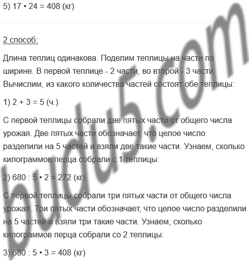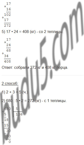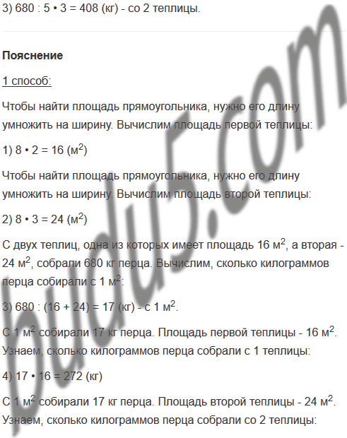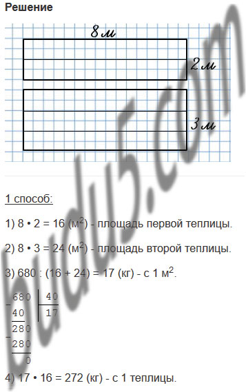 70. В двух теплицах, каждая из которых имеет прямоугольную форму, собрали 680 кг перца. Длина каждой теплицы 8 м, ширина одной 2 м, а другой 3 м. Сколько килограммов перца собрали в каждой теплице, если с 1 м2 собирали одинаковое количество килограммов перца?