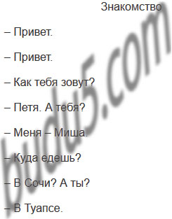 Составьте диалог на темы: «Знакомство», «Сведения о месте жительства», «Сведения о природных условиях места» (на выбор). Употребляйте, где следует, неполные предложения.