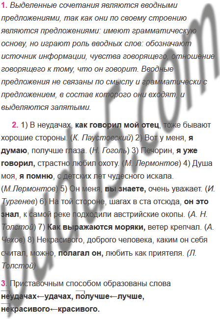 1) В неудачах как говорил мой отец тоже бывают хорошие стороны. (К. Паустовский) 2) Вот у меня я думаю получше глаза. (Н. Гоголь) 3) Печорин я уже говорил страстно любил охоту. (М. Лермонтов) 4) Душа моя я помню с детских лет чудесного искала. (М.Лермонтов) 5) Он меня вы знаете очень уважает. (И. Тургенев) 6) На той стороне, шагах в ста отсюда он это знал к самой реке подходили австрийские окопы. (А. Н. Толстой) 7) Как выражаются моряки ветер крепчал. (А. Чехов) 8) Некрасивого, доброго человека, каким он себя считал, можно полагал он любить как приятеля. (Л. Толстой)