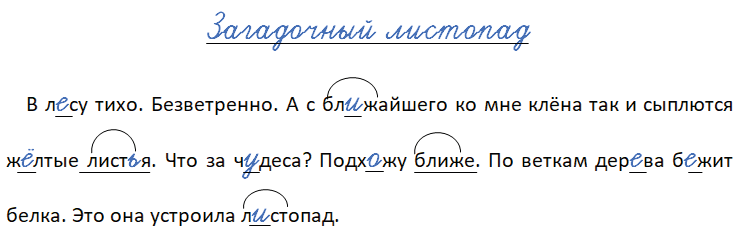 В л_су тихо. Безветренно. А с бл_жайшего ко мне клёна так и сыплются ж_лтые лист_я. Что за ч_деса? Подх_жу ближе. По веткам дер_ва б_жит белка. Это она устроила л_стопад.