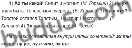 1) Ах ты какой! Сидит и молчит. (М. Горький) 2) Ну уж, так и быть. Теперь моя очередь. (В. Катаев) 3) Ну и что? Толстой остался Толстым, Шекспир Шекспиром... (В. Катаев) 4) Эх вы, горе-повара! (А. Чехов)
