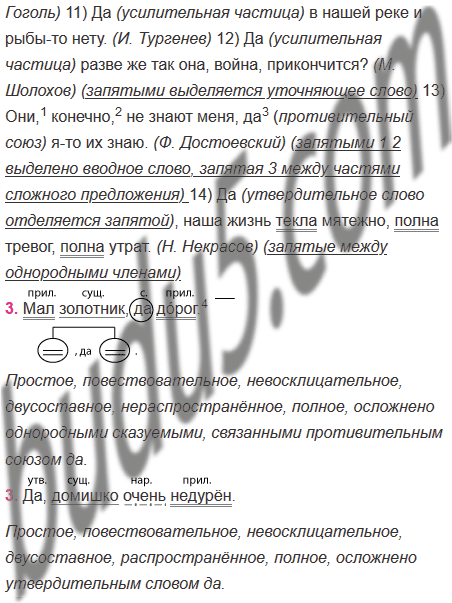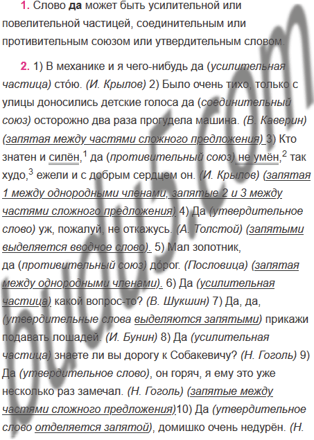 1) В механике и я чего-нибудь да сто́ю. (И. Крылов) 2) Было очень тихо, только с улицы доносились детские голоса да осторожно два раза прогудела машина. (В. Каверин) 3) Кто знатен и силён, да не умён, так худо, ежели и с добрым сердцем он. (И. Крылов) 4) Да уж, пожалуй, не откажусь. (А. Толстой) 5) Мал золотник, да до́рог. (Пословица) 6) Да какой вопрос-то? (В. Шукшин) 7) Да, да, прикажи подавать лошадей. (И. Бунин) 8) Да знаете ли вы дорогу к Собакевичу? (Н. Гоголь) 9) Да, он горяч, я ему это уже несколько раз замечал. (Н. Гоголь) 10) Да, домишко очень недурён. (Н. Гоголь) 11) Да в нашей реке и рыбы-то нету. (И. Тургенев) 12) Да разве же так она, война, прикончится? (М. Шолохов) 13) Они, конечно, не знают меня, да я-то их знаю. (Ф. Достоевский) 14) Да, наша жизнь текла мятежно, полна тревог, полна утрат. (Н. Некрасов)