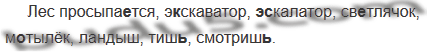 Лес просыпа..т(?)ся, э(?)скаватор, э(?)скалатор, св..тлячок, м..тылёк, ландыш(?), тиш(?), смотриш(?).