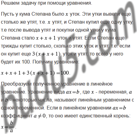 (Задача из русского фольклора). Кум Иван спросил у кума Степана: "Сколько у тебя уток?" Кум Степан ответил: "Уток у меня столько, что как высидят они мне еще столько утят, да еще куплю одну утку, да еще трижды куплю столько, сколько этих уток и утят, то всего будет их у меня 100". Сколько уток было у кума Степана?