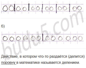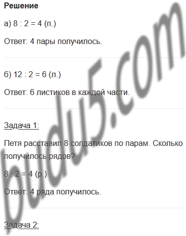 а) 12 листиков разделили на равные части по 2 листика в каждой. Сколько получилось частей?