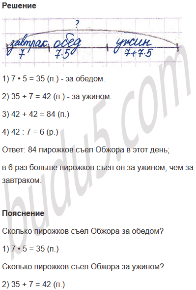Задание № 7. В некотором царстве жил-был Обжора. Однажды он съел за завтраком 7 пирожков, за обедом - в 5 раз больше, а за ужином - столько пирожков, сколько за завтраком и за обедом вместе. Сколько пирожков съел Обжора в этот день? Во сколько раз больше пирожков съел он за ужином, чем за завтраком?
