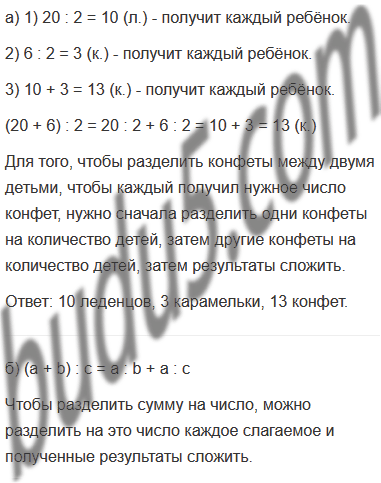 а) Мама купила 20 леденцов и 6 карамелек. Как разделить их поровну между двумя детьми, чтобы каждый получил одинаковое число конфет каждого вида?
