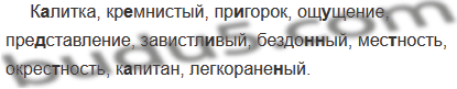 К..литка, кремнистый, пр..горок, ощ..щение, пре..ставле ние, завистливый, бездо(н,нн)ый, местность, окрестность к..питан, легкоране(н, нн)ый.