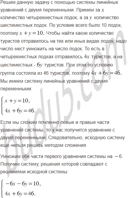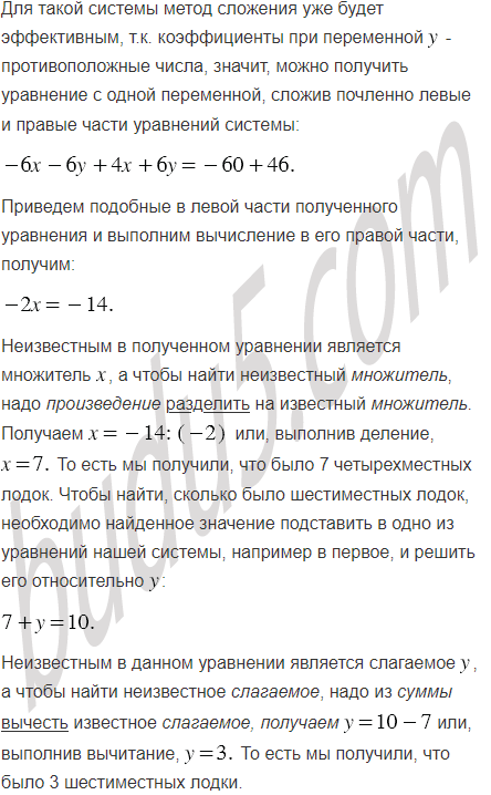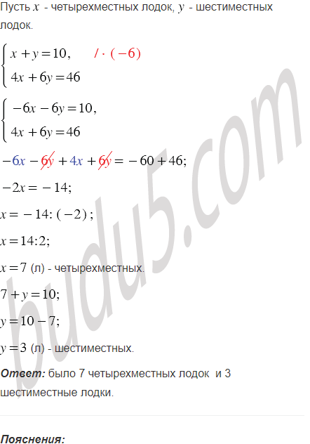 Группа из 46 туристов отправилась в поход на 10 лодках, часть из которых была четырёхместными, а остальные - шестиместными. Сколько было лодок каждого вида?