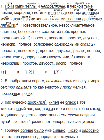 1. Ночи были теплы и (не)проглядны в ч..рной тьме плыли мерцали светили топазовым светом огне(н, нн)ые мухи стекля(н, нн)ыми колокольчиками зв..нели др..весные л..гушки.4 2. В пр..брежном овраг., спускавш..мся из лесу к морю быстро прыгала по кам..нистому ложу мелкая, прозрач(?)ная реч(?)ка. 3. Как чудес(?)но др..бился кипел её блеск в тот таинстве(н, нн)ый час, когда (из)за гор и лесов, точно какое(то) дивное существо, пристально смотрела поз(?)няя луна! 4. Горяч..е солнце было уже сильно чисто и радо(?)но. 5. В лесах лазурно светился ра..ходился и таял душистый туман за дальними лесистыми вершинами с..яла пр..двечерняя белизна снежных гор.