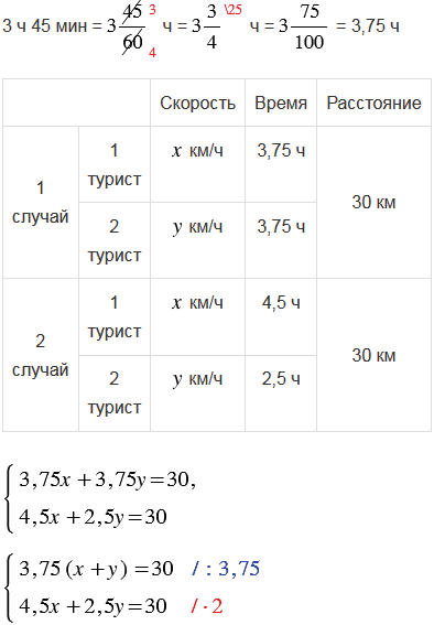 Из двух пунктов, расстояние между которыми равно 30 км, одновременно навстречу друг другу вышли два туриста и встретились через 3 ч 45 мин. Если бы первый из них вышел на 2 ч раньше второго, то они встретились бы через 4,5 ч после выхода первого. Найдите скорость каждого туриста.