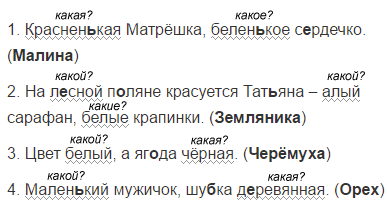 Отгадать загадки помогают прилагательные, которые употреблены в тексте, поскольку именно прилагательные позволяют представить то, что загадывается.     Красненькая Матрёшка, беленькое сердечко. (Малина - ягода красная, а внутри каждого шарика белое зёрнышко).  На лесной поляне красуется Татьяна – алый сарафан, белые крапинки. (Земляника - ягода красного цвета с белыми семечками). Цвет белый, а ягода чёрная. (Черёмуха - цветёт пышными белыми цветами, а ягоды у неё тёмные). Маленький мужичок, шубка деревянная. (Орех - мужичок, потому что крепкий и мужского рода, деревянная шубка - скорлупа).
