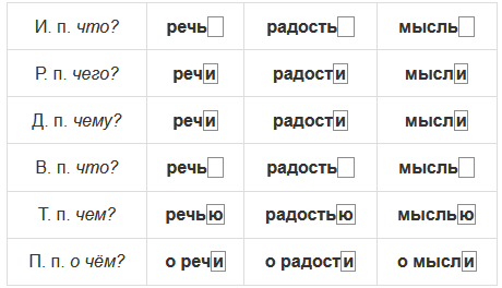 | Р. п. чего? | ре́чи | ра́дости | мы́сли |
